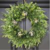 - WELL-MADE This autumn wreath is made of high quality silken cloth and fiber, handmade by florists, realistic shape and full of colors. The outdoor wreath base is durable natural grapevine, strong and durable, not easy to fall off. The fall door wreath is packaged in a relatively small box for shipping requirements, and the branches can be adjusted for the perfect shape when disassembled.