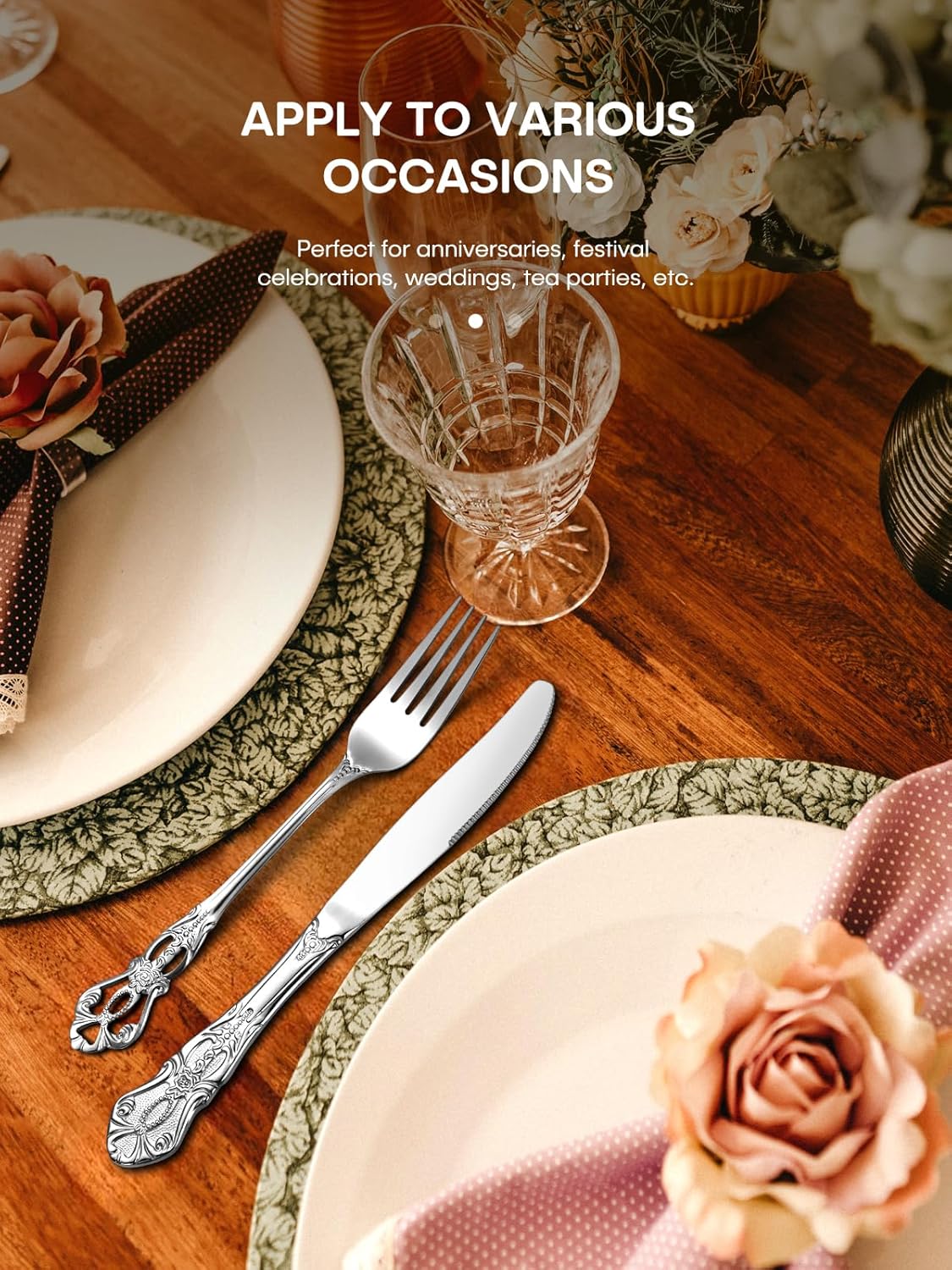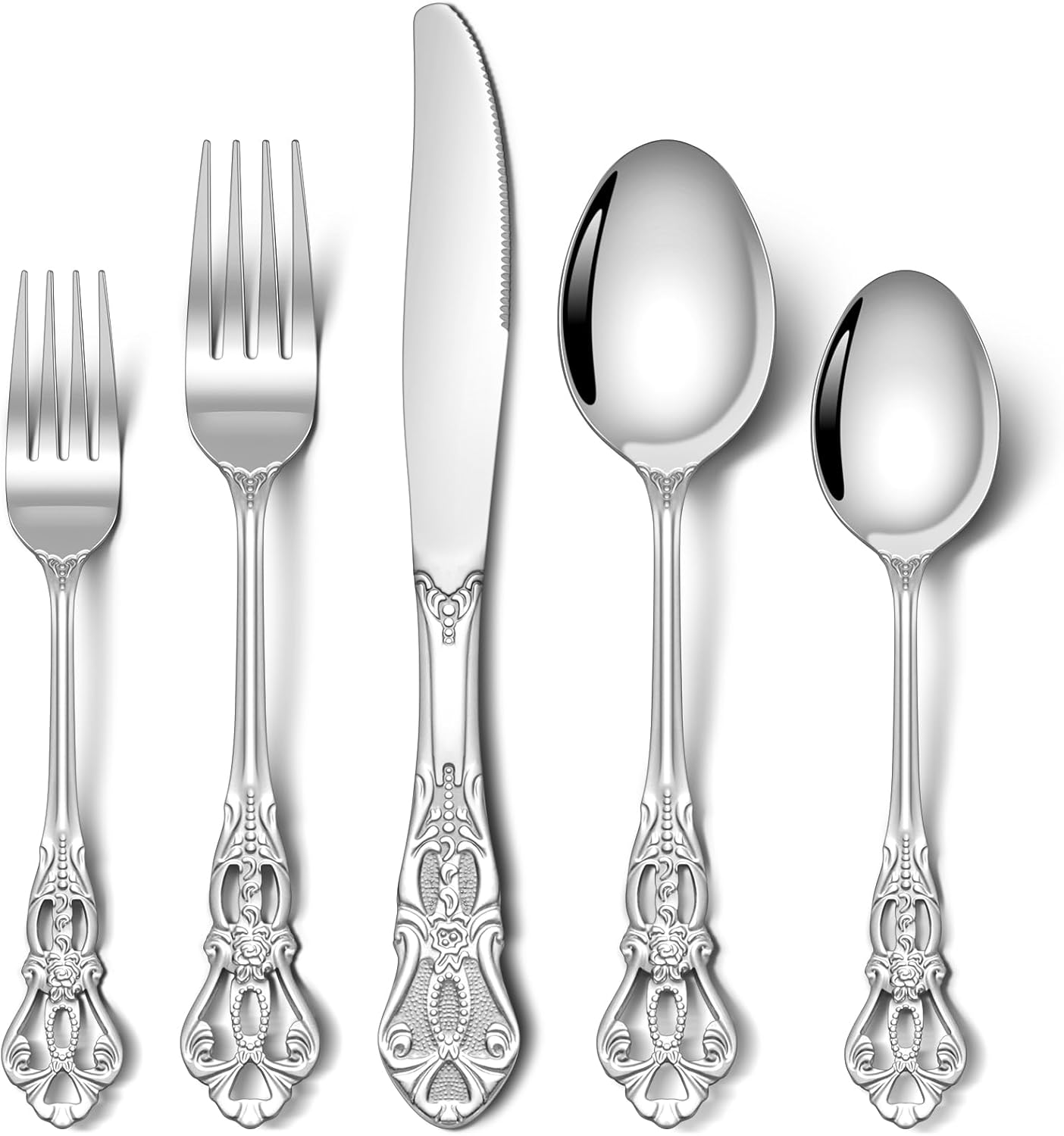 • 30PCS RETRO SILVERWARE SET – Including 6 dinner knives, 6 dinner forks, 6 dinner spoons, 6 salad forks, and 6 teaspoons. The gorgeous and classy design is perfect for daily use and goes well with any style of home decor. It can also used as a table setting for family gatherings, parties, candlelight dinners, festival celebrations, housewarming, weddings, picnics, boudoir tea parties, etc.