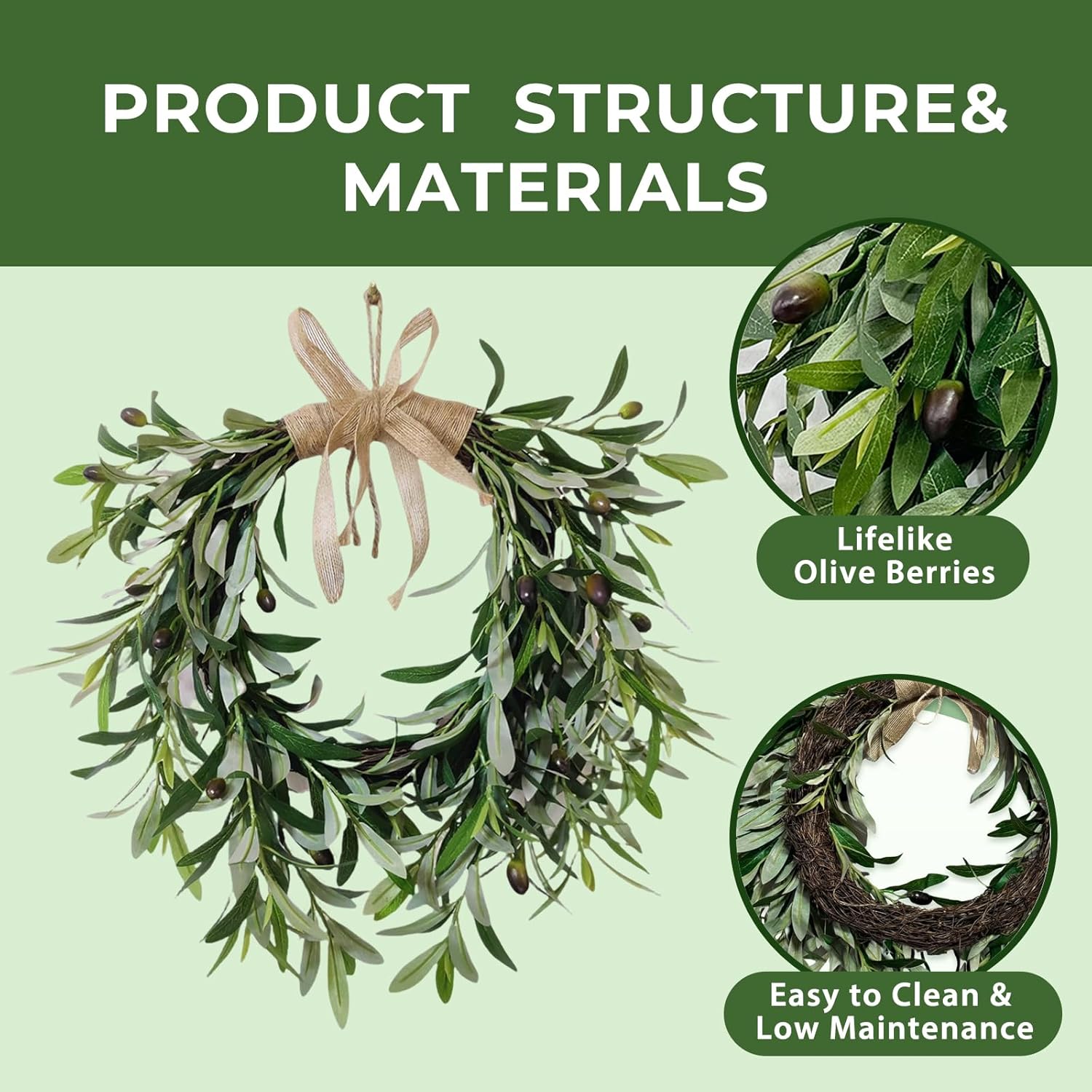 - Lifelike Olive Greenery Look – Featuring faux olive branches with textured leaves and realistic dark green fruits, this wreath brings a natural touch to any space without the need for maintenance.