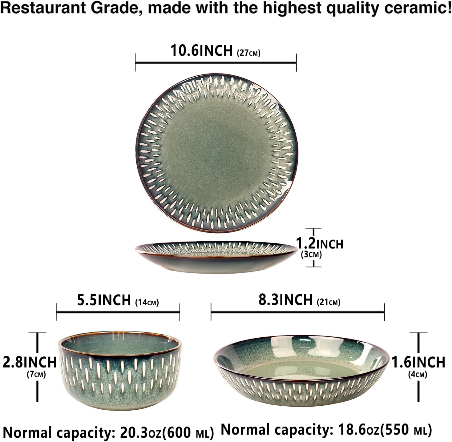 • Practical 12-Piece Set – The Ceramic Tableware set includes 4-pcs 10.6″(27 CM)dinner plates; 4-pcs 8.3″(21 CM)Salad plates capacity 18 Ounces(550 ML); and 4-pcs 5.5″Cereal/Soup bowls capacity 20 Ounces(600 ML), catering to your dining needs with versatility and functionality.